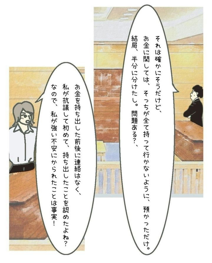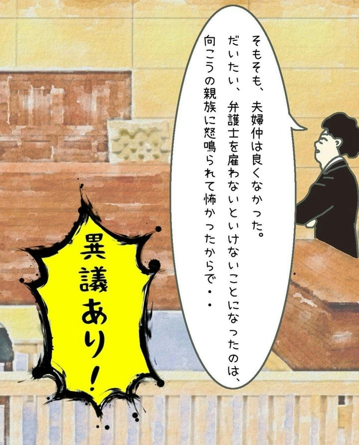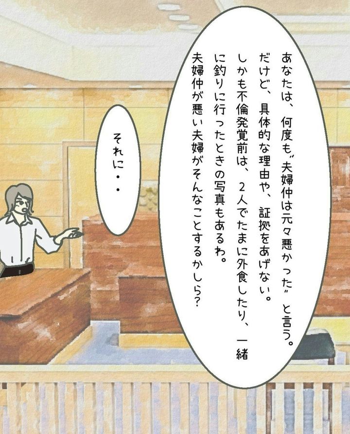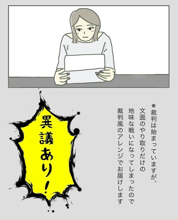 まりもさん夫婦の離婚の話し合いは泥沼化し、ついに裁判が始まります。自分のことは棚に上げ、あたかも不倫の原因は妻側にあった…というようなことを主張する夫。