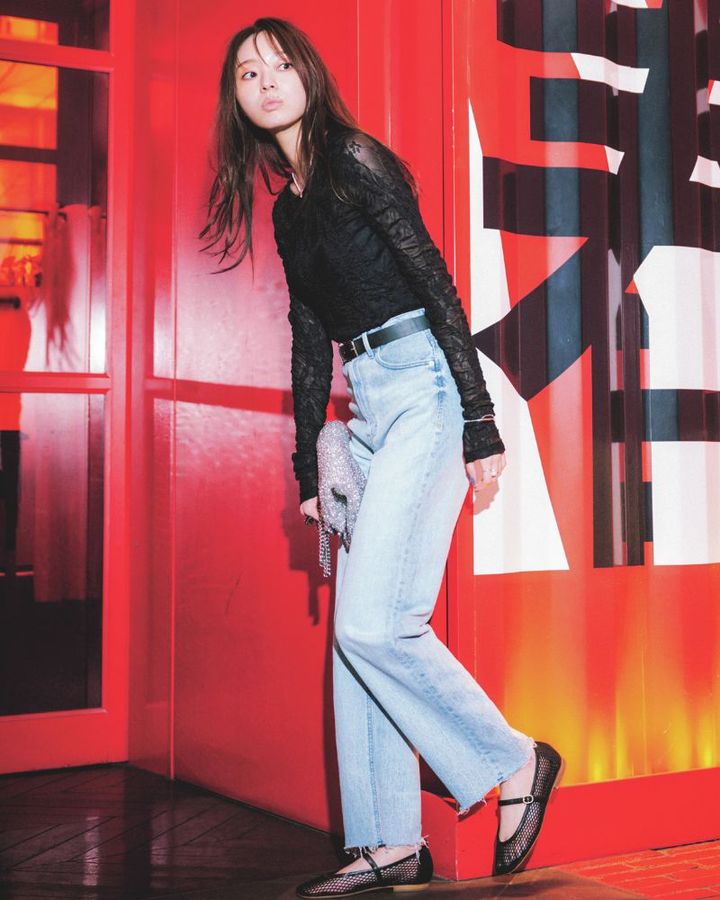 5月10日(土)、大胆な透け感のある黒レーストップスは、着こなし次第で媚びて見えず着慣れた表情に一変。ウォッシュ加工の効いた薄色デニムと合わせることで、カジュアル要素が加わり気負わず取り入れられます。さらに素脚を覗かせたメッシュサンダルを投入して肌見せを分散させれば、悪目立ちせず色気たっぷりからモードっぽく印象チェンジ。