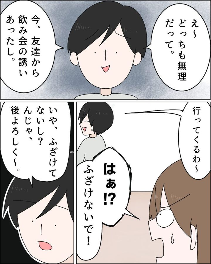 「どっちも無理」と平然とユキヒロは言いました。義母を呼んでおきながら、焦る私を置いて今から友達と飲み会に出かけるなどとふざけたことを言い放ったのです。「ふざけてないし?んじゃ、後よろしく~。」と、余裕の態度が更に腹立たしい!俄かにバタバタし始めた私を横目に、ユキヒロは出かけてしまいました。
