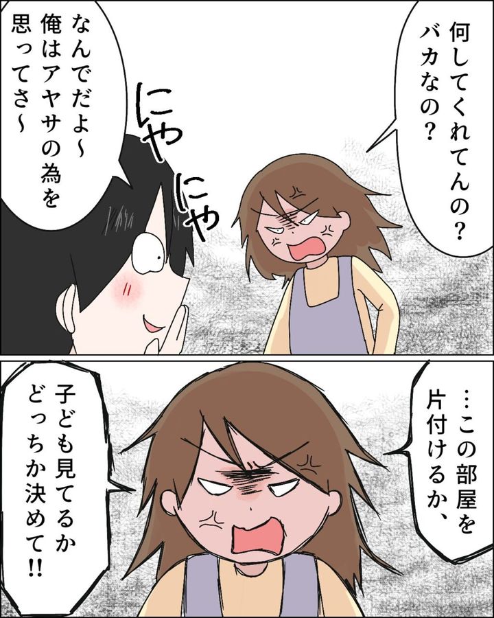 私の怒りはどんどん増してきて、「何してくれてんの?バカなの?」と言っても、「なんでだよ~。俺はアヤサのためを思ってさ。」と白々しく言いました。「この部屋を片付けるか、子ども見てるかどっちか決めて!!」義母が来る前に部屋だけでもきれいにしておかなくては!ユキヒロに言うと