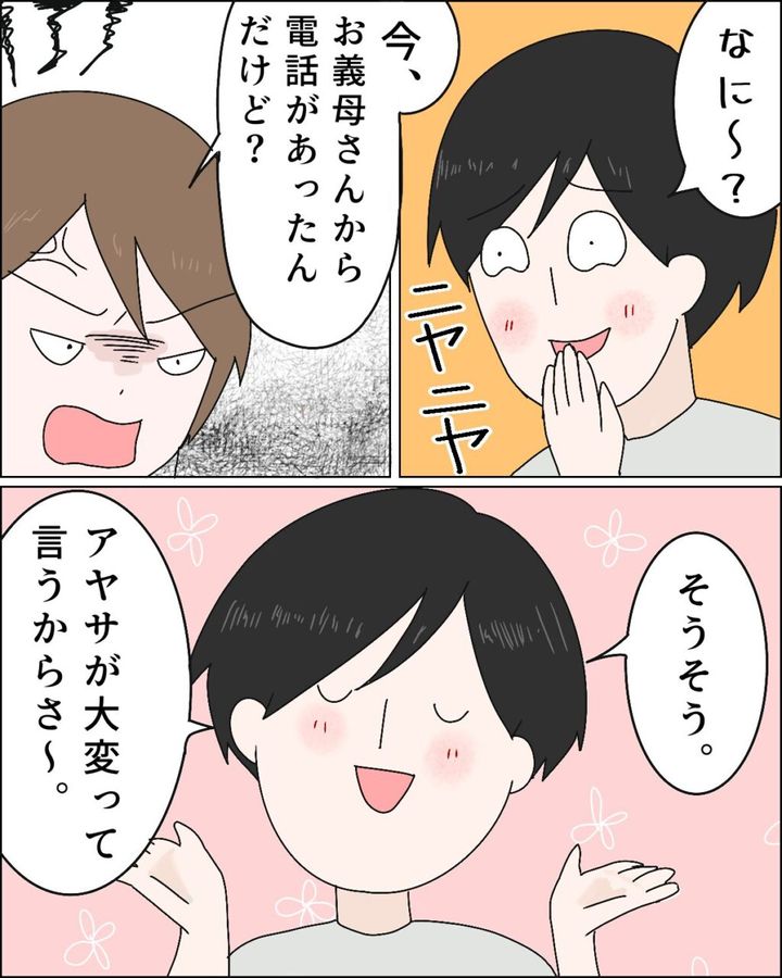妙に張り切った様子の義母から「しばらく行くわ」と連絡があったので、急いでユキヒロを呼びました。「なに~?」と、とぼけてニヤニヤするユキヒロにイラッとしながら「今、お義母さんから電話があったけど?」と聞くと「そうそう、アヤサが大変って言うからさ~。」と、さも私のためにしてあげたような言い方。