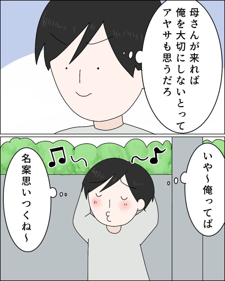 「母さんが来れば俺を大切にしないとってアヤサも思うだろ」と考えたユキヒロさん。我ながら名案を思いついたと自画自賛しながら、のん気に友達と飲みに行ってしまいました。