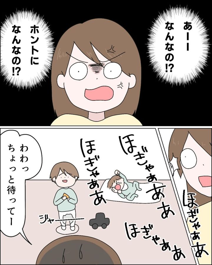 ホントになんなの!?私のためとか言って嫌がらせでしかありません。それでも私にはそんなことを考えている余裕さえありませんでした。お昼寝していたナツキが目覚めて泣き出したのと同時に、チアキがお漏らしをして、カオス。