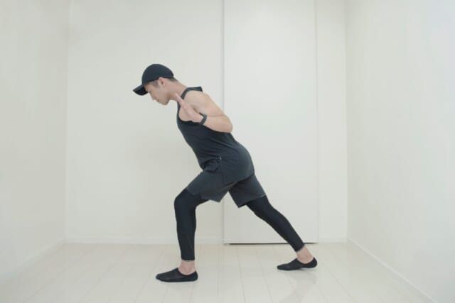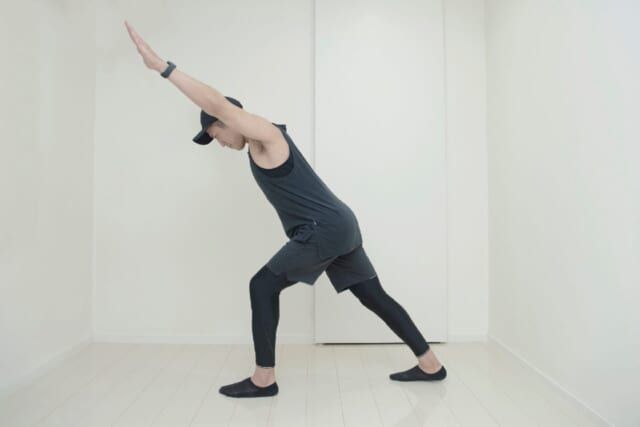 (1)脚を前後に大きく開き、上半身を斜め45度に前傾してYの字を描くように両腕を上げる