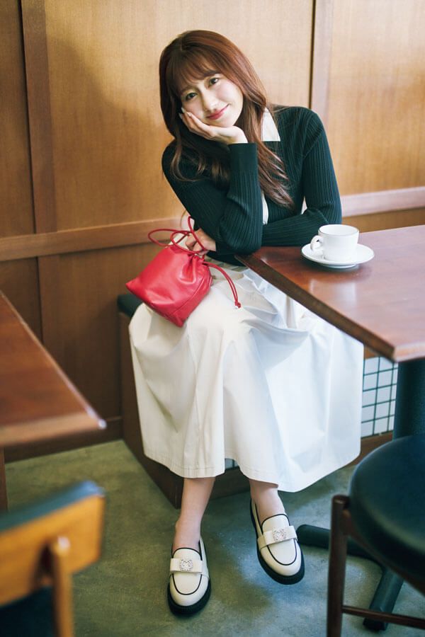 リボンやビジューデザインを選んで甘さも確保。足元からトラッド感を漂わせてくれるローファー。モノトーン×赤のコントラスト強めのグッドレディなコーデもメリハリボディにしっかりフィット。