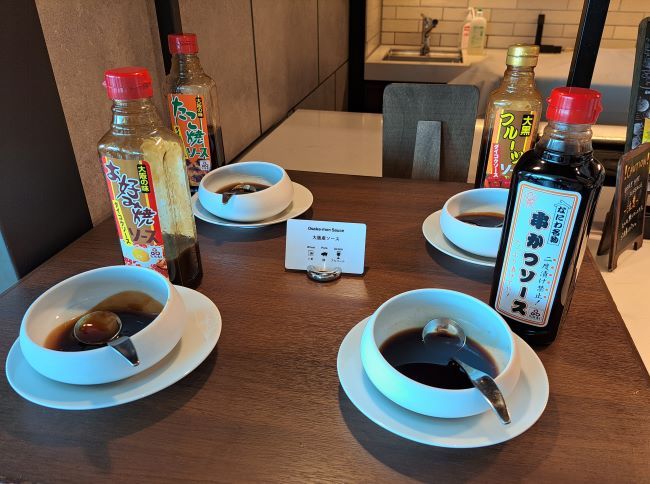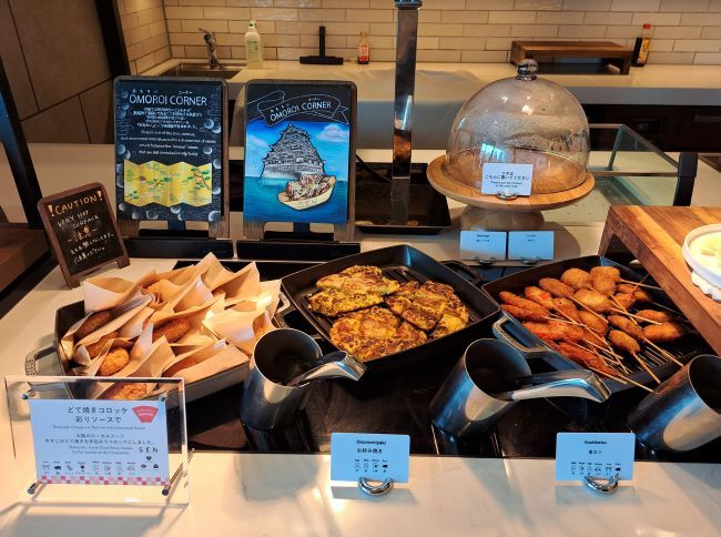 もう一つのコンセプト“OMOROI”コーナーには、どて焼きコロッケやお好み焼き、串揚げ、たこ焼きといった大阪ならではのユニークなメニューが並んでいました。好みの大阪産ソースをチョイスできます。