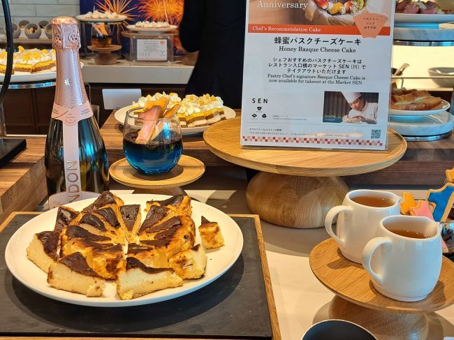 17:30からの「1周年セレブレーションヨーロピアンディナービュッフェ」では、ランチメニューのほかディナー限定の「鮮魚のカルパッチョ イタリアンヴィネグレットソース」などの豪華メニューが堪能できます。スイーツも約10種がスタンバイ。中でも「蜂蜜バスクチーズケーキ」はペストリーシェフ・山口慎吾さんの自信作だそうで、ランチ・ディナー両方で楽しめるうえ、レストラン隣接の「マーケット SEN(川)」でも販売しています。