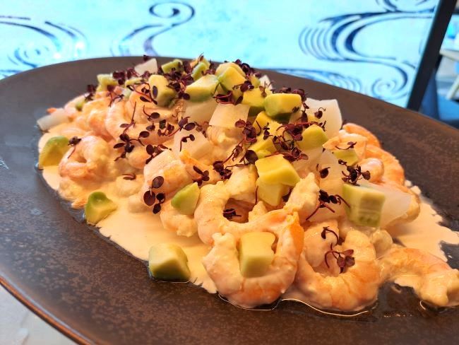 「スモークサーモンのオニオン添え マンゴードレッシング」や「ワカサギのエスカベッシュ 柚子こしょう風味」など、冷製メニューも並びます。「小海老と小貝柱 アボカド 大根の甘酢添え 山葵風味」(写真・下)は、クリーミーなアボカドに甘酢がマッチ。ワサビはほんのり香る程度なのでツーンとはなりませんでした。