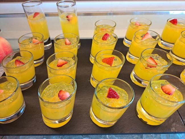 アニバーサリーを演出する花火で彩られたスイーツコーナーには、大阪城の歴史を思わせる抹茶など和の要素と、爽やかなマンゴーをメインにした約15種類のスイーツが、1口サイズで並びます。