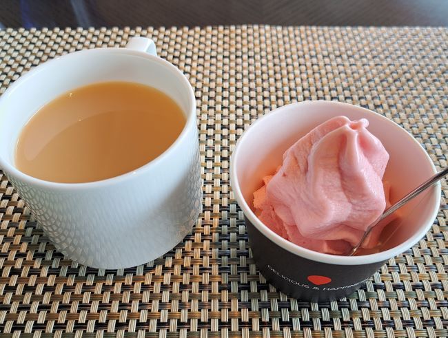 何度か通り過ぎながらも気になっていた機械は、ソフトクリームサーバーでした。下の冷凍庫にあるバニラ・ストロベリー・チョコレートのアイスを選んでセットすると、自動で渦巻きソフトクリームにしてくれます。ストロベリーを選んでドキドキしながらセット。後ろに並んでいた女性たちと一緒に手順を確認しながら操作しました。できあがったソフトクリームに歓声が!