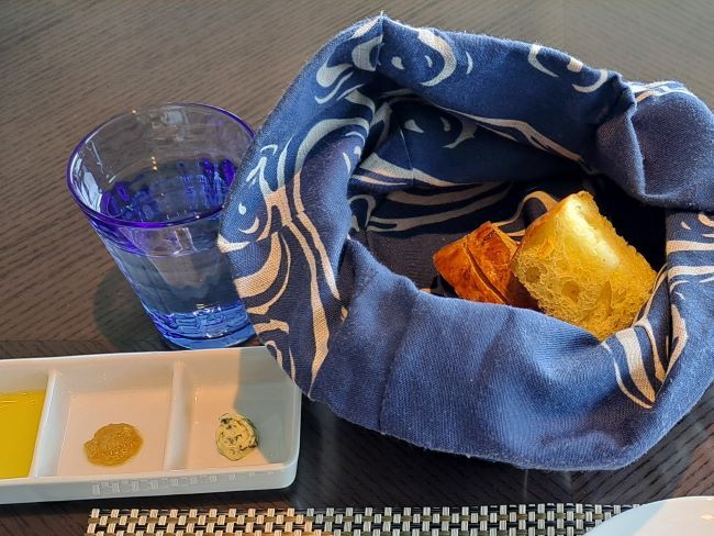 “パンは常に温かいものを”という心遣いから、パンはビュッフェ台ではなくテーブルでサーブされます。パンを入れるバスケットも、厚手の布で覆って保温性が高くなるように工夫しているのだそう。パンは季節ごとに種類が変わり、試食ではオニオンブレッドとコーンフォカッチャをいただきました。添え付けのオリーブオイルとバーニャカウダーも試しましたが、ワカメを練り込んだバターが斬新でした。