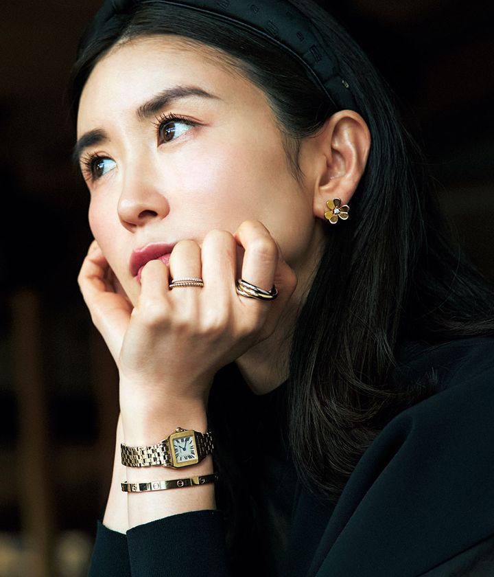 ブレスレット、時計、人差し指のリング〈すべてカルティエ〉イヤリング、薬指下のリング〈ともにヴァン クリーフ&アーペル〉(すべて本人私物)ジレ¥57,200ニット¥20,900(ともにLE PHIL)カチューシャ¥39,600(アレクサンドル ドゥ パリ/アレクサンドル ドゥ パリ GINZA SIX店)