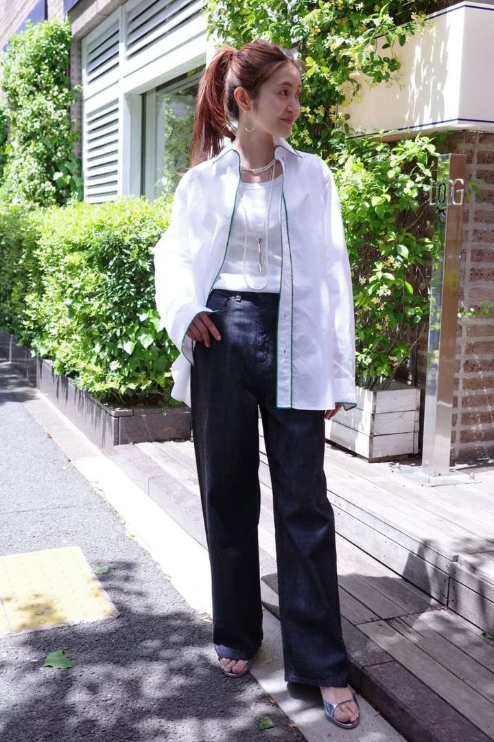 「RH Vintageのデニムはウエストまわりがスッキリとしていますが、ワイドシルエットなのでスタイルアップしてくれます。薄手の生地ではき心地がいいところもポイント。デニムスタイルに欠かせないのがシルバージュエリーで、スーパーロングのナバホパールのネックレスは3重にして、チョーカーとロングネックレスを重ねづけしているように着用するのがお気に入り。ソフィーブハイの一輪挿しをモチーフにしたペンダントは存在感があり、シンプルなスタイリングが好きな私には欠かせないアイテムです!」