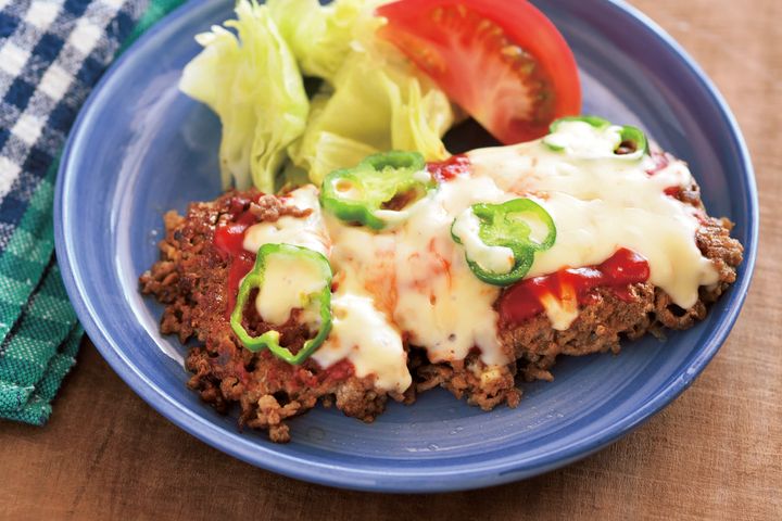 フライパンにサラダ油小さじ1を中火で熱し、冷凍合いびき肉200ɡを凍ったまま入れる。ふたをして弱めの中火で5分ほど焼き、焼き色がついたら裏返す。塩、こしょう各少々をふり、トマトケチャップ大さじ2、ピーマンの輪切り1/2個分、ピザ用チーズ30ɡを順にのせる。ふたをして2~3分蒸し焼きにする。