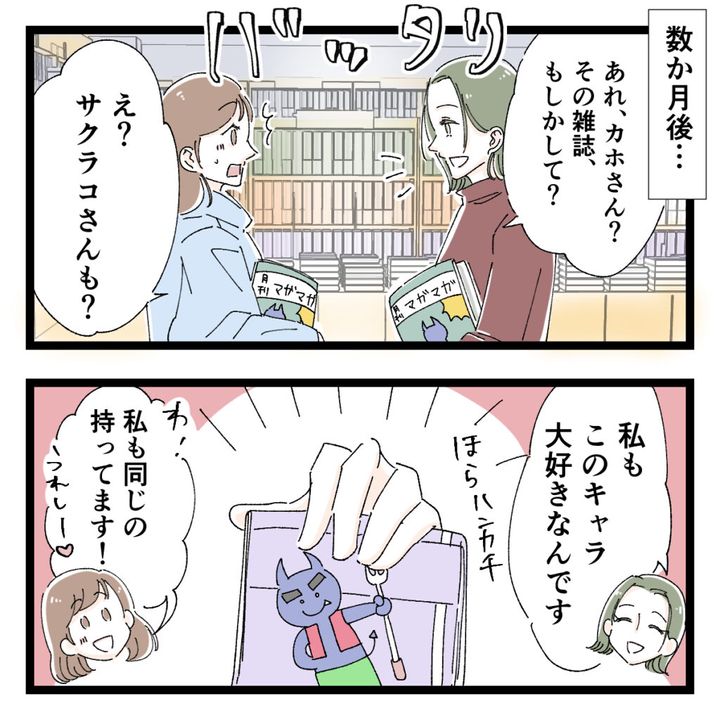 「あれ、カホさん?その雑誌もしかして?」「え?サクラコさんも?」と本屋さんでサクラコさんとバッタリ!なんと持っている本も一緒でさらにビックリしていると、「私もこのキャラ大好きなんです。ほらハンカチ」と持っていたハンカチを差し出され、思わず「わ!私も同じの持ってます!うれしー」と声を上げてしまいました。