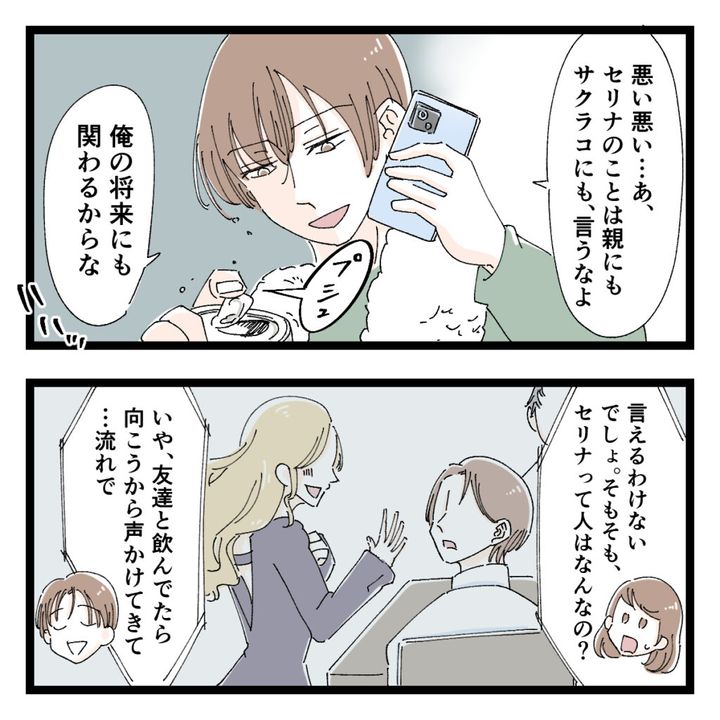 「悪い悪い・・あ、セリナのことは親にもサクラコにも言うなよ。俺の将来にも関わるからな。ハハッ」とハルキに言われ、「言えるわけないでしょ。そもそも、セリナって人はなんなの?」と言い返すと、「いや、友達と飲んでたら向こうから声かけてきて・・流れで」そう話すハルキに、