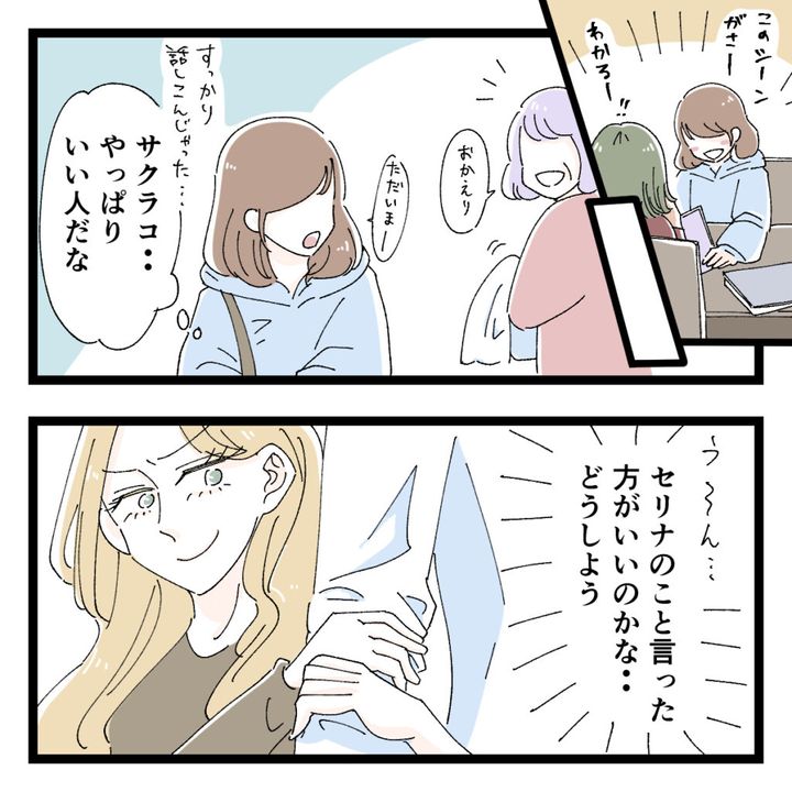 その後、意気投合して話し込んだ後家に帰った私。「すっかり話し込んじゃった・・サクラコ・・やっぱりいい人だな」と思いながら、「う~ん・・セリナのこと言った方がいいのかな・・どうしよう」と考え込んでしまいました。