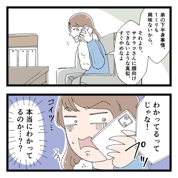「弟の下半身事情、1ミリも興味ないから。それより、サクラコさんに顔向けできないような真似、すぐやめなよ」ハルキにそう言うと、「わかってるって!じゃな!」そう言ってすぐに電話を切られてしまい、「コイツ・・本当にわかってるのか・・??」と呆れてしまいました。