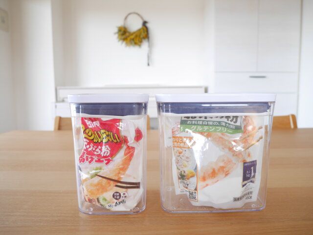 小麦粉や片栗粉など、よく使う粉物は、袋のまま置いておくとゴチャゴチャする上にどれがどれだか分かりづらいのが難点。