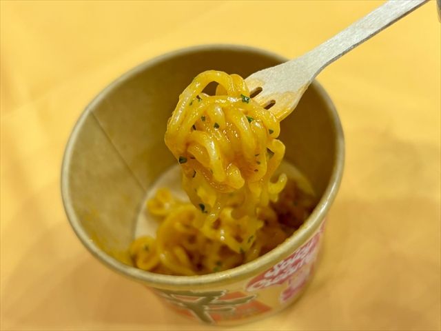 ブース内で無料配布されていたのは、カップタイプの「辛ラーメン トゥーンバ」。一口すすると、濃厚なクリームパスタのようなソースにもちもちの麺が絡み、非常に食べやすい!