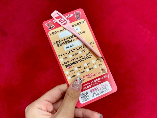 辛ラーメンの公式SNS(Instagram・TikTok・X)をフォローすることで入場可能。ブースの入り口では、辛ラーメンにまつわるクイズ用紙が配られ、全問正解するとフォトスポットや試食コーナーに移ることができます!