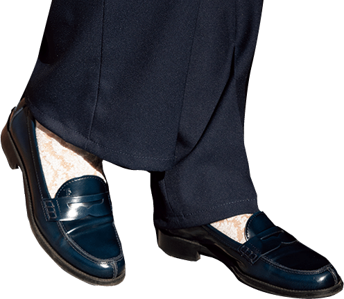 ネイビーのローファーにホワイトのレースソックス。甘さをちらりと覗かせて。