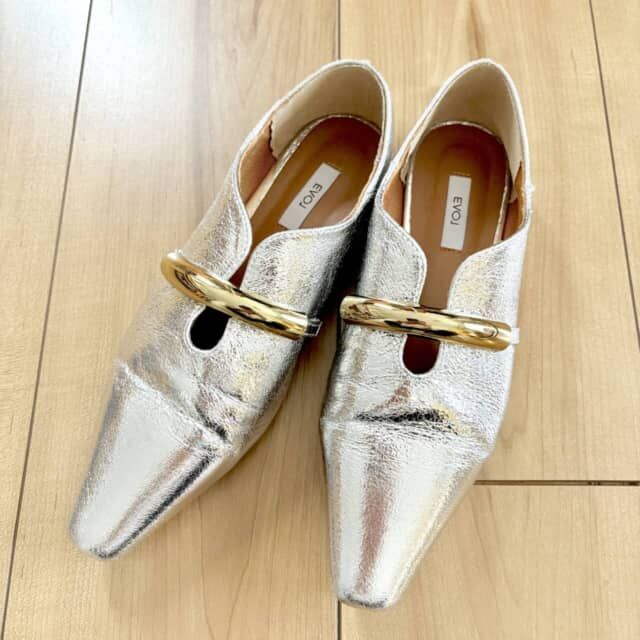 2025春夏トレンドのメタリックなシルバーカラーが着こなしを一気にクラスアップしてくれます。こちらのフラットパンプスは、上品なゴールドモチーフがアクセントとなり、カジュアルスタイルもきれいめコーデも格上げする万能さが魅力。しかも、ソフトな素材で足にしっかりフィットする履き心地で、長時間歩いても痛くなりにくく、かかとを倒してミュールとしても履けるので、シーンに合わせて使い分け可能です。