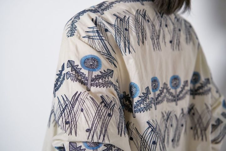 「たんぽぽをはじめとした雑草が規則正しく並んだテキスタイルがお気に入り。裏地がついていないので、ブラウスのように軽くはおれるところも気に入っています」