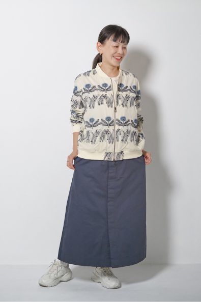 たんぽぽなどの雑草をモチーフにしたテキスタイルが印象的なMA-1ブルゾンを主役に、白×落ち着いたネイビーの配色で清潔感のある着こなしに。