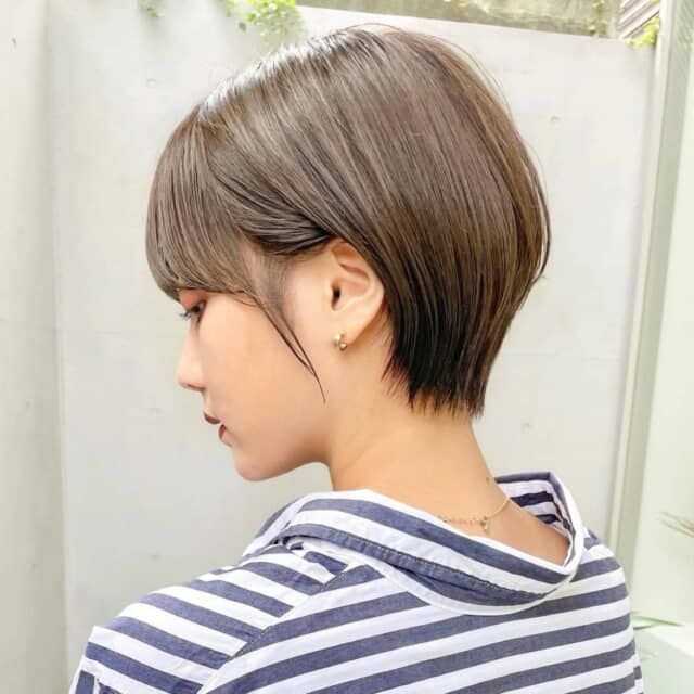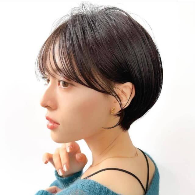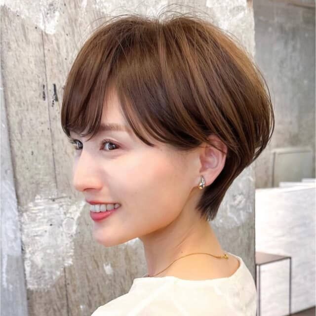 丸みシルエットのショートに、頬骨をカバーする前髪を組み合わせれば、自然な小顔見せ効果も。耳出しやくびれのあるスタイルで抜け感をプラスすれば、洗練された大人の雰囲気に仕上がるでしょう。