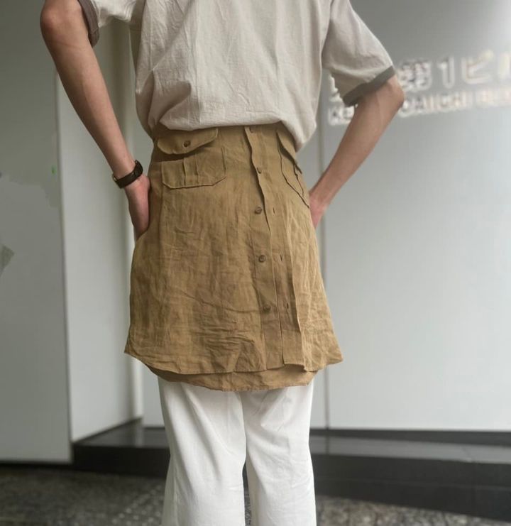 さらに腰巻きには相田流のこだわりがあるそう。「これは肩かけでも実践しているのですが、必ず前身頃が表になるように巻いています。シャツはボタンもこだわっているので、それが見えないように巻くのはもったいないと思っていて(笑)。しかも今回はダブルポケットのシャツを選んでいるので、よりバックスタイルを印象的に演出してみました」