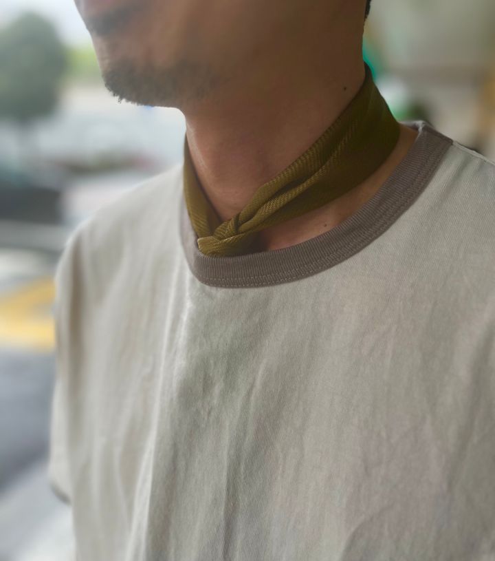 首に巻いたスカーフはコンパクトにセットするのがお決まり。こちらもアースカラーをチョイスして統一感を持たせています