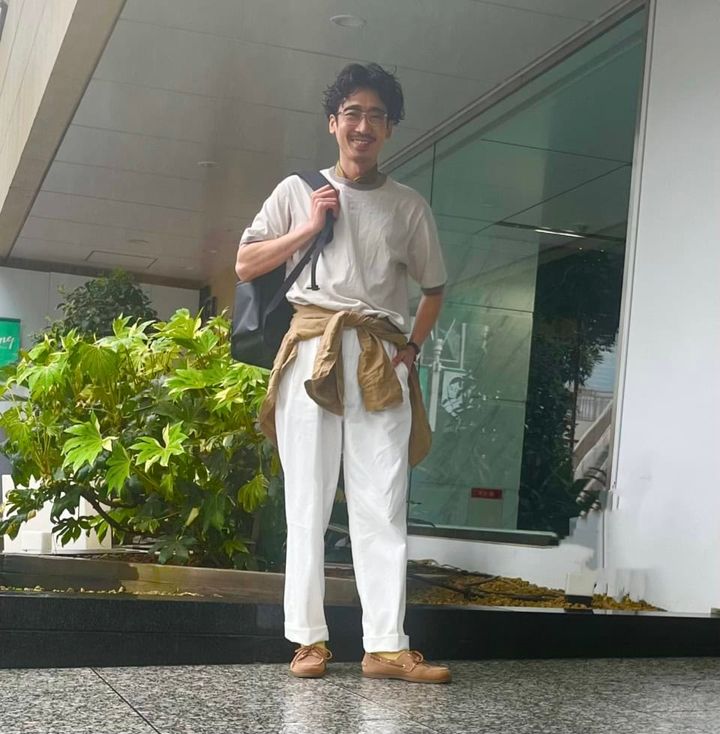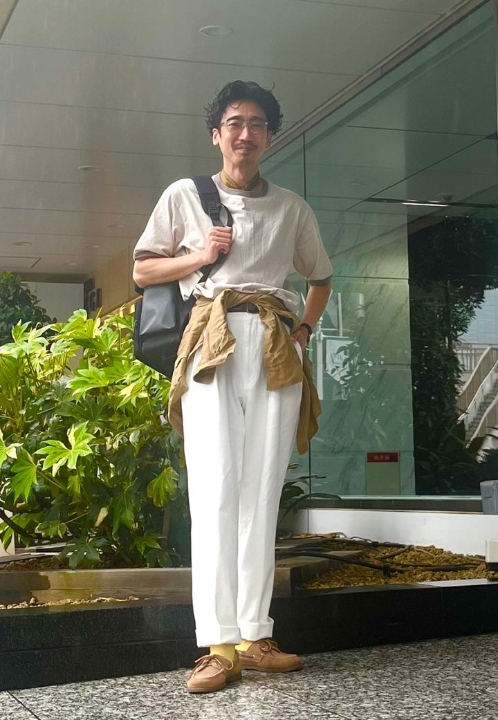 ボトムスはあえて白というのもポイント。「ボトムスもベージュだと重くなってしまうので、初夏感を高めるためにクリーンな白をチョイスしました。ただ、Tシャツがライトベージュだとメリハリのないコーデに見えるので、腰にリネンシャツをプラスしています。じつは腰巻きはかなり優秀で、スタイリングの洒落度をアップさせるだけでなく、体型カバーにもなるのがイイんです。肩かけに飽きたら、ぜひ試してみてください! 」