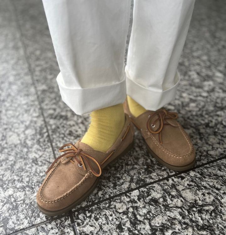 「アースカラーは大人っぽく落ち着いた印象を与えられますが、それだけでまとめると野暮ったく見えてしまうんです」と語る相田さんの足元を見ると、ヴィヴィッドなイエローがチラリ。「それを解消するには差し色が効果的ですが、僕は1色だけと決めています。2色以上になると、どこがポイントかわからなくなっちゃうこともあるから。今回はよりさりげなく効かせたかったのでソックスで取り入れましたが、スカーフで取り入れるのもオススメです」