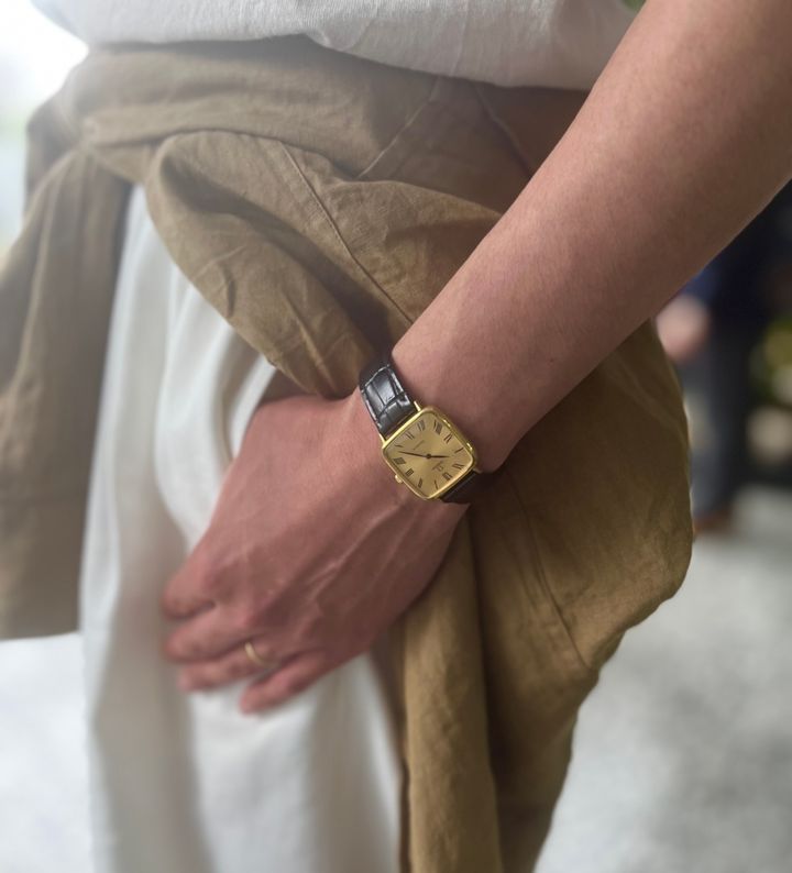 腕時計はアースカラーと相性がいいゴールドを。クロコのストラップもクラス感アップに貢献