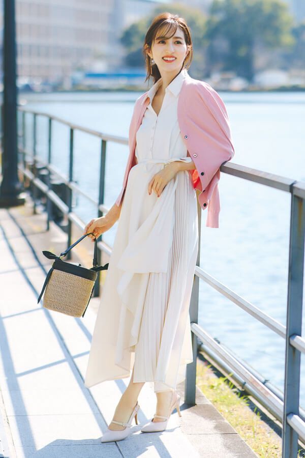 オフホワイトワンピに、ピンクのカーデがまろやかに調和して優しげ。カーデはラフに肩掛けすると、時折のぞく腕の肌見せで抜け感上々に。気温調整と美人度アップを両立♡