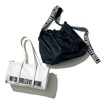 〈右〉ナイロンバッグ/HOLIDAY(ホリデイ/フラッグシップサロン オフィス) 〈左〉ロゴボストンバッグ(ストラップつき)/パドゥダンス(アーバンリサーチ ストア ルクア大阪店) スポーティなフォルムでも、反対色のレタリングが入るだけできりっと引き締まった表情で使える。