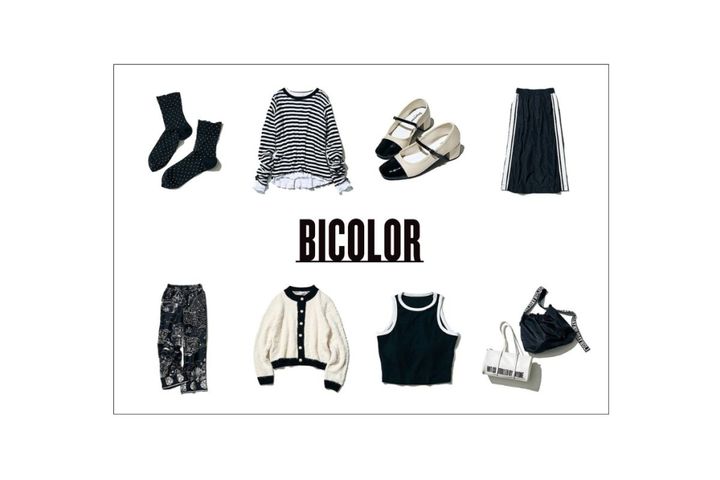 それ自体に白と黒に含ませたバイカラーのアイテムを選ぶと、それ自体はベーシックなものでもスタイリングのいいアクセントとして作用。単色よりも奥行きが出るうえ、無難でも悪目立ちもしない実力十分のラインアップ。