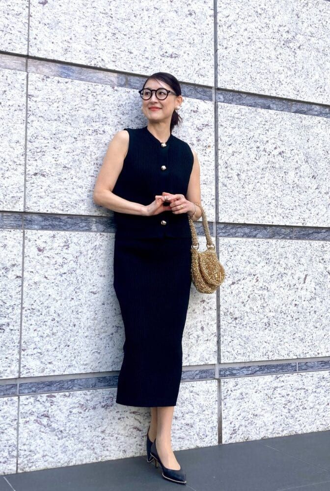 3. 【60代お手本スナップ】「ブラック×ゴールド」で品のある着こなしに!「エルフランク」のセットアップでIラインを作ってスタイルアップ!