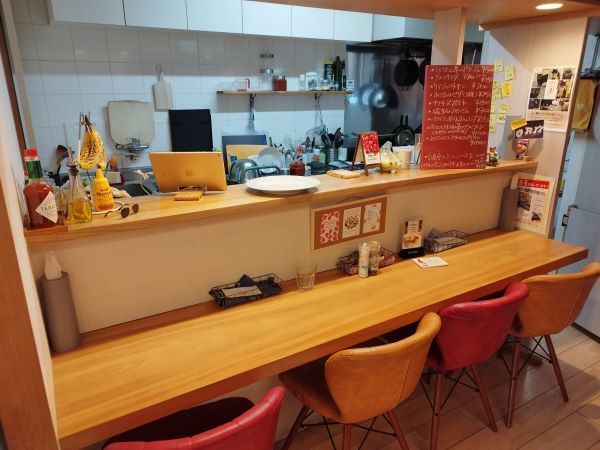 清潔感溢れる店内は、カジュアルなカフェバーの雰囲気。1階は、テーブル席1卓+カウンター席でこぢんまりしていますが、実は、こちらには秘蔵の地下階があるんです。