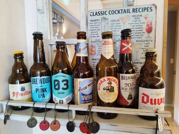バーカウンターの棚には世界各国の瓶ビールが並んでいます。ベルギーのデュベル(1,000円)、スコットランドのブリュードッグ パンク IPA(1,000円)、イタリアのモレッティ ラガー(900円)などなど、飲み比べしたい!