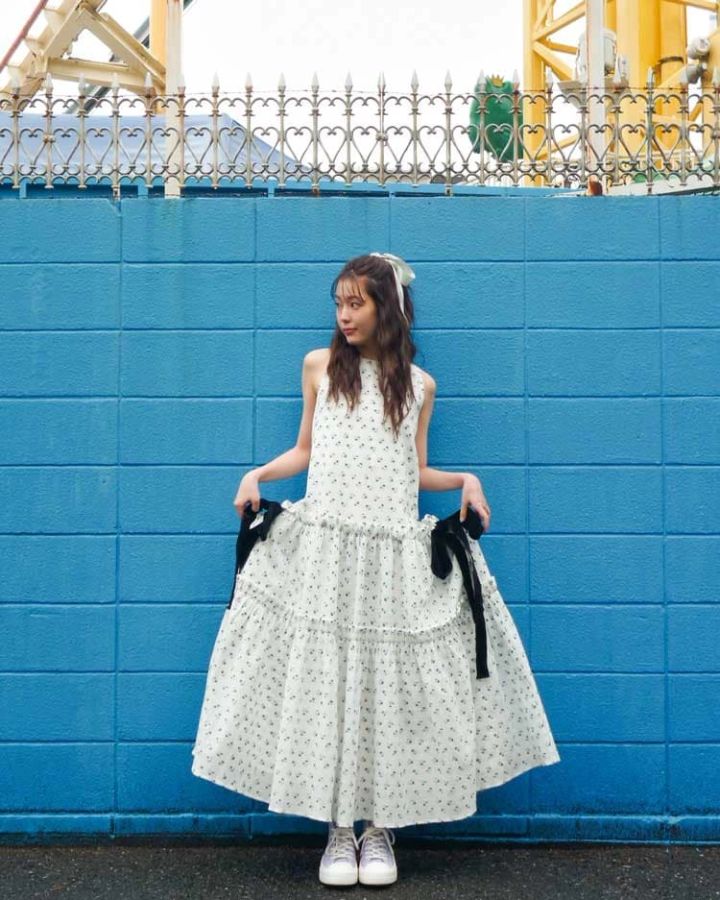小花柄ワンピース 27,500円/カロリナ グレイサー(ビームス公式オンラインショップ)イヤリング 2,090円/GOLDY スニーカー 11,550円/コンバース ヘアリボン/スタイリスト私物