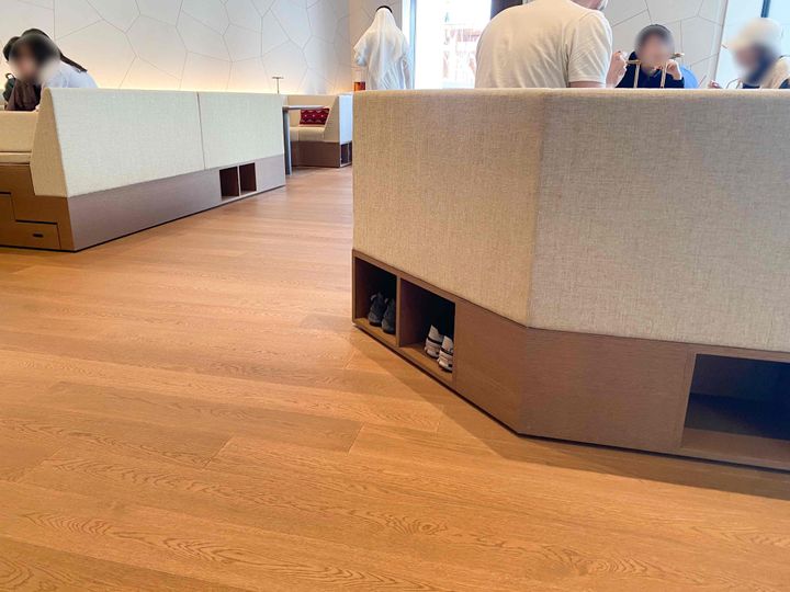 屋内の席とテラス席、どちらに案内されるかは時の運。それぞれにそれぞれのよさがあると思います。今回は、シューズを脱いで座るスタイルの屋内の小上がりの席に案内していただきました。