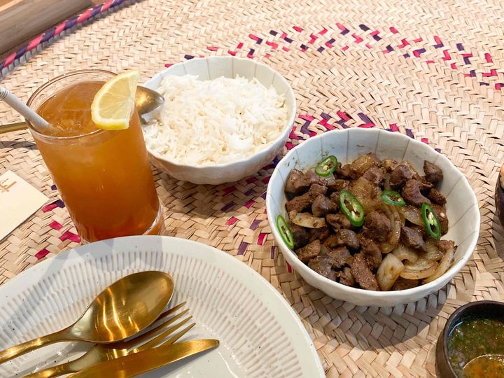 「マクトータ」2,500円 は、牛のハツとレバーを玉ねぎや唐辛子などでソテーした、食欲をそそる一皿。歯応えも食べ応えも抜群で、ライスが進みます。なかなか味が濃いので、お皿に取り分けて2〜4人でシェアするのがおすすめです。