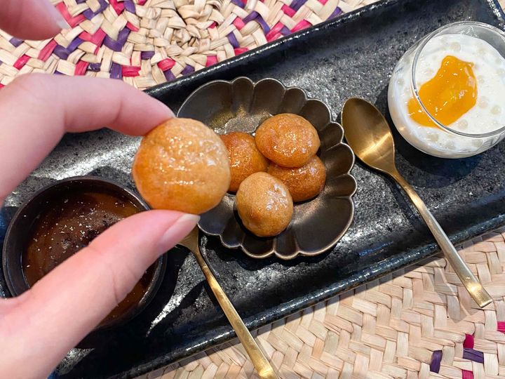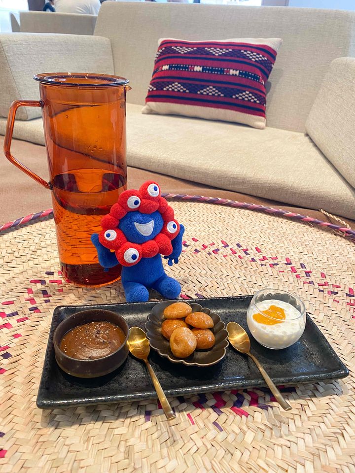 真ん中の、焼いた大麦をベースにデーツのシロップとブラックライムのソースをかけた「マクシュシュ」は、シュー生地のような軽やかな食感と植物由来の自然な甘さがすごく美味しかったです。
