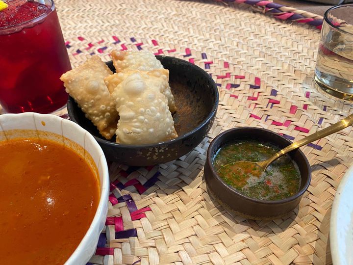 イスラム教徒にとって最も神聖な月とされる“ラマダン期間”を中心に食べられる「メディニアン・サモサ」1,000円 は、ぼこぼこした見た目がカラッと揚がった証拠。スパイシーなソースを付けていただきます。