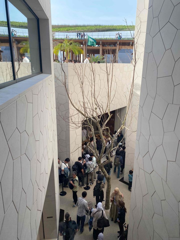 サウジレストランから外を眺めると、大屋根リングの上がすぐそこに。また、下を見ると、パビリオン内を観覧するたくさんの入場客が。ここでしか出会えない絶景が広がっていました。