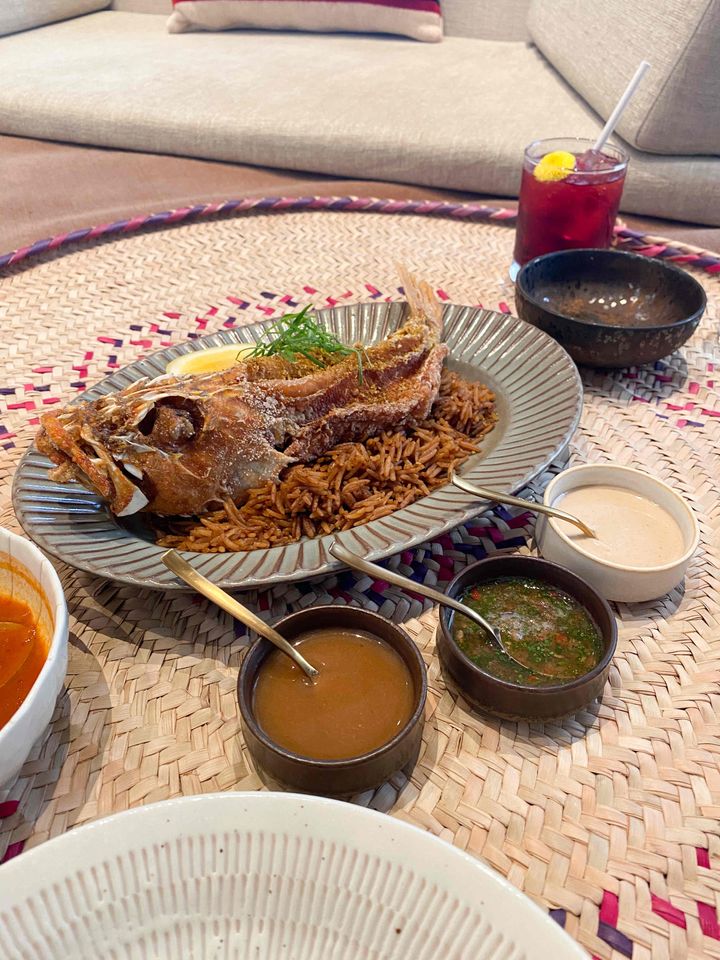 「サイヤディーヤ」5,500円 は、旬の魚を丸ごと揚げたインパクト大の大皿料理。梅干しのような味と言われている“タマリンド”風味のスパイスライスとの相性がよく、そのエキゾチックな味わいに感動しました。サウジアラビアでも、沿岸料理として食されています。
