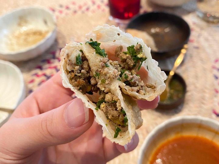 ハーブなどで味付けした牛ひき肉と薄い生地、ソースの組み合わせが美味しくて、今回食べたお料理の中では最も親しみやすいと感じました。