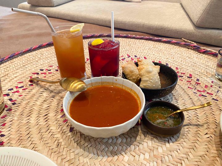 まずは、サウジアラビアの家庭でも親しまれる、赤っぽい色の「ハッブ・スープ」900円。大麦・トマト・ローストボーンマローが溶け込んだスープな、少しの酸味と旨みを感じる味わい深いスープです。ローストボーンマローとは、牛の骨髄を焼き上げたもので、パンなどにバターのように塗って使われることもあるよう。